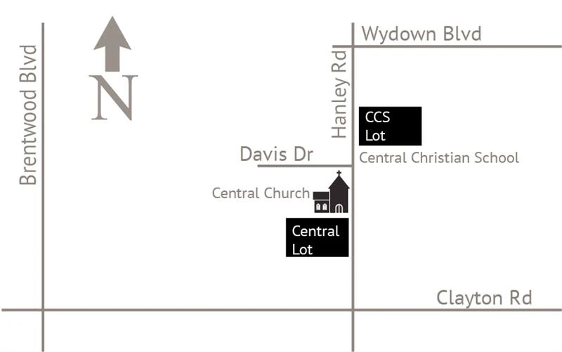 In addition to our Hanley Road garage adjacent to the church, Central offers convenient remote parking at Central Christian School (700 South Hanley). Please note: Street parking near Central is limited to spaces on Davis Dr. and Biltmore Dr. immediately adjacent to our property.